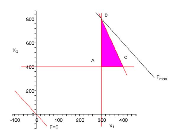 , передвигать в направлении области допустимых решений (заштрихована) параллельно самой себе, то значение целевой функции увеличивается, и будет максимальным в крайней точке области допустимых значений, в данном случае в вершине В. Координаты этой точки найдем, решив, совместно уравнения