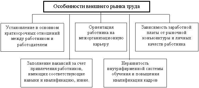 Внешний рынок труда предполагает достаточно развитые рыночные отношения с наличием совершенной службы информации о вакансиях и предложении рабочей силы, системы посреднических услуг, условиями для высокой мобильности рабочей силы. На рис.3.1.1. представлены предпосылки его формирования, на рис. 3.1.2. – его отличительные особенности.