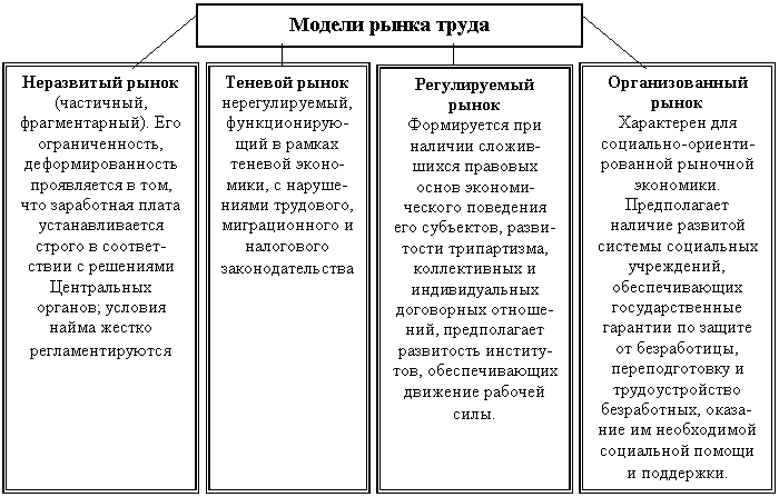 В зависимости от зрелости рыночных отношений, степени и характера их регулирования со стороны государства выделяют несколько моделей рынка труда (рис.3.2.1).