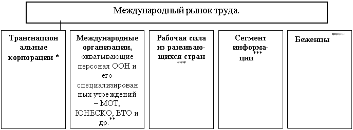 Международный рынок труда формирует и шлифует особый тип универсальной и гибкой рабочей силы. Основой для ее формирования является создание полноценного рынка труда в пределах самой России, активная миграционная политика. На рис. 3.3.3. выделены основные сегменты международного рынка труда.