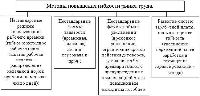 Количественная гибкость предполагает изменения числа занятых и уровня заработной платы в зависимости от экономической конъюнктуры и ситуации на рынке труда. Функциональная гибкость обусловлена использованием различных форм занятости, которые обеспечивают гибкость рабочего времени. Методы повышения гибкости рынка труда приведены на рис.3.4.1.
