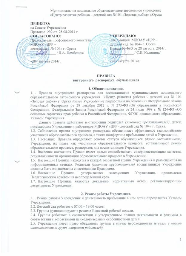6.3. Забирая ребенка, родитель (законный представитель) должен обязательно подойти к воспитателю, который на смене. Категорически запрещен приход ребенка дошкольного возраста в Учреждении и его уход без сопровождения родителей (законных представителей).