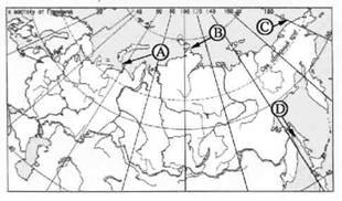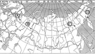 Определите, в каком из пунктов, обозначенных буквами на карте Евразии, 1 августа Солнце будет находиться ниже всего над горизонтом в 9 часов по солнечному времени Гринвичского меридиана. Запишите обоснование своего ответа.