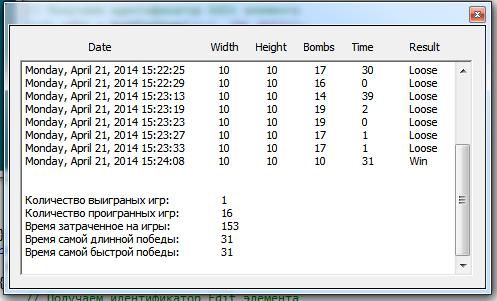 В запись входят: Дата игры, параметры поля и количество мин, время, затраченное на игру и результат игры – выигрыш/проигрыш.