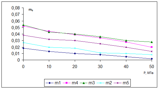 Рисунок 1 Зависимость открытой пористости от всестороннего давления, m1, m2, m3, m4, m5 - номера образцов.
