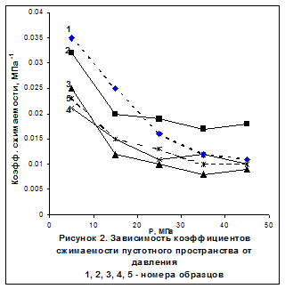 Коэффициент сжимаемости открытых пор (пустотного пространства) и коэффициент объемной сжимаемости в зависимости от давления определяются соотношениями