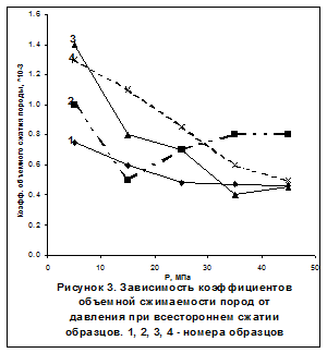По разработанному совместно с Р. И. Медведским и М. Е Стасюком техническому заданию и по предложенной методике на установке, созданной на кафедре физики Горного института (г. Екатеринбург) были проведены испытания образцов керна баженовской свиты. Измерялись продольные, перпендикулярные напластованию (e∥) и поперечные, вдоль напластования, (e^) деформации при ступенчатом нагружении образца всесторонним давлением до 50МПа с выдержкой на каждой ступени до 5 минут при температуре 25-50° С. Затем нагрузки сбрасывались и проводился замер остаточных деформаций. Обработка результатов испытаний образцов скв.124 Салымского месторождения показала, что продольные деформации плотных баженитов в 4-5 раз больше, поперечных, что свидетельствует о резко выраженной анизотропии пород,