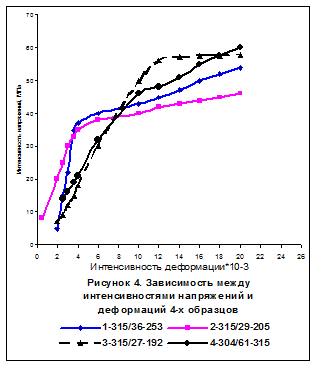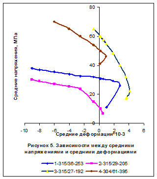 где σ i и εi – интенсивности напряжений и деформаций, σср и εср=θ/3 – средние напряжение и деформация. По измерянной деформации при известных нагрузках, по известным формулам определяются σ i, εi, σср и εср.. и строятся зависимости σср-εср, σ i - εi (рисунки 4,5). Из (4) определялись модули деформирования G, K, Е.