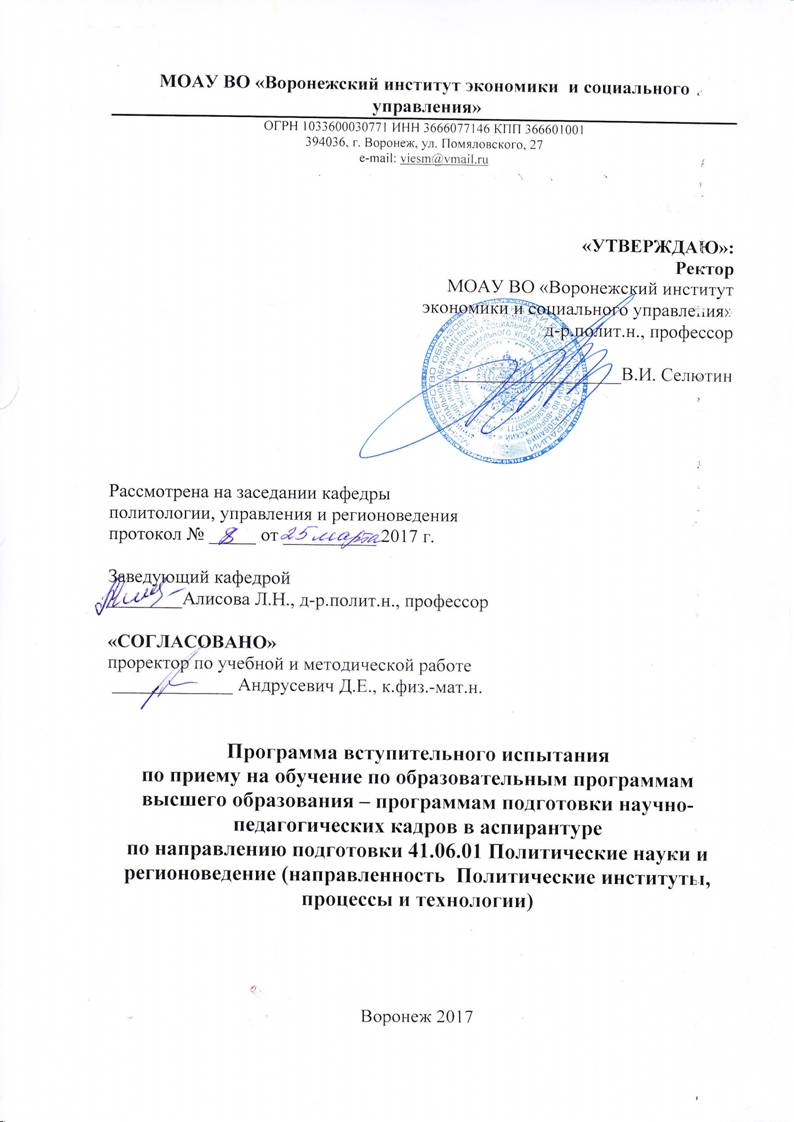 Программа вступительного экзамена в аспирантуру по специальности 23.00.02 Политические институты, процессы и технологии – направление подготовки 41.06.01 Политические науки и регионоведение) разработана с учетом Закона об образовании в Российской Федерации от 29 декабря 2012 г Приказом Министерства образования и науки Российской Федерации от 01.01.2001 г. №13 «Об утверждении Порядка приема на обучение по образовательным программам высшего образования - программам подготовки научно-педагогических кадров в аспирантуре» (зарегистрировано в Минюсте России 03.03.2017 N 45843); Приказа Минобрнауки от 17 октября 2016 г. № 000 «Об установлении соответствия направлений подготовки высшего образования - подготовки кадров высшей квалификации по программам подготовки научно-педагогических кадров в аспирантуре, применяемых при реализации образовательных программ высшего образования, содержащих сведения, составляющие государственную тайну или служебную информацию ограниченного распространения, направлений подготовки высшего образования - подготовки кадров высшей квалификации по программам подготовки научно-педагогических кадров в адъюнктуре, применяемых при реализации образовательных программ высшего образования, содержащих сведения, составляющие государственную тайну или служебную информацию ограниченного распространения, перечни которых утверждены приказом Министерства образования и науки Российской Федерации от 12 сентября 2013 г. N 1060, и направлений подготовки высшего образования - подготовки кадров высшей квалификации по программам подготовки научно-педагогических кадров в аспирантуре, направлений подготовки высшего образования - подготовки кадров высшей квалификации по программам подготовки научно-педагогических кадров в адъюнктуре, перечни которых утверждены приказом Министерства образования и науки Российской Федерации от 01.01.01 г. N 1061, научным специальностям, предусмотренным номенклатурой научных специальностей, утвержденной приказом Министерства образования и науки Российской Федерации от 25 февраля 2009 г. N 59»; Приказа Министерства образования и науки РФ от 26 марта 2014 г. № 000 «Об утверждении Порядка приема на обучение по образовательным программам высшего образования – программам подготовки научно-педагогических кадров в аспирантуре», Приказа Министерства образования и науки РФ от 30 июля 2014 г. N 900 "Об утверждении федерального государственного образовательного стандарта высшего образования по направлению подготовки 41.06.01 Политические науки и регионоведение (уровень подготовки кадров высшей квалификации)"