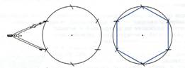 (4) Интересно, что построить правильный шестиугольник можно с помощью циркуля. Для этого достаточно начертить окружность и «пройтись» по ней циркулем с шагом, равным её радиусу (рис. 4). Соединив последовательно все полученные точки, вы и получите правильный