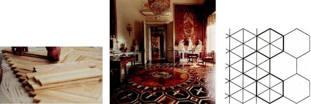 (5) Вы, конечно, знаете, что такое паркет. Обычно, это дощечки прямоугольной формы, выложенные «ёлочкой» (рис. 5). Но составление паркета может быть и искусством. Им в совершенстве владели мастера, создававшие паркеты во дворцах царей и вельмож (рис. 6).