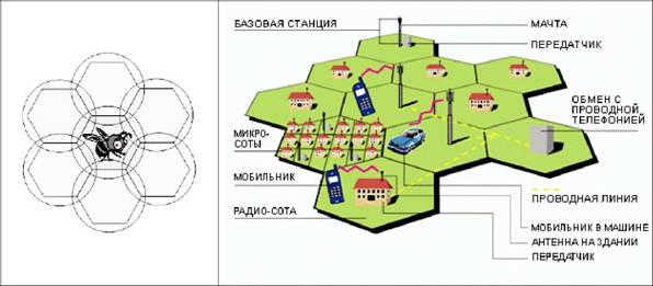 «Сотовая связь – один из видов мобильной радиосвязи, в основе которого лежит сотовая сеть. Ключевая особенность заключается в том, что общая зона покрытия делится на ячейки (соты), определяющиеся зонами покрытия отдельных базовых станций (БС). Соты частично перекрываются и вместе образуют сеть. На идеальной (ровной и без застройки) поверхности зона покрытия одной БС представляет собой круг, поэтому составленная из них сеть имеет вид сот с шестиугольными ячейками (сотами).»