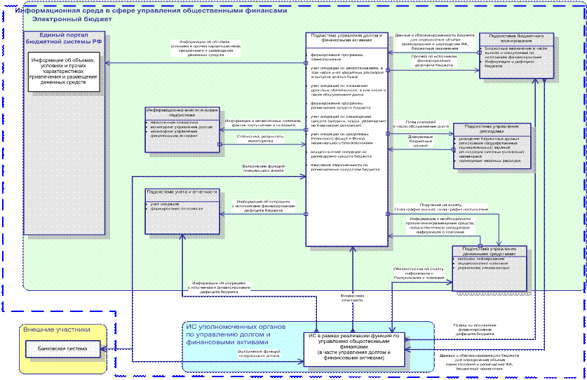 Подсистема управления долгом и финансовыми активами должна быть интегрирована с подсистемой бюджетного планирования, подсистемой управления расходами, подсистемой управления денежными средствами, подсистемой учета и отчетности, информационно-аналитической подсистемой, подсистемой финансового контроля, ведения реестров, справочников и формуляров системы «Электронный бюджет», а также взаимодействовать с информационными системами уполномоченных органов по управлению долгом и финансовыми активами, банковской системой.