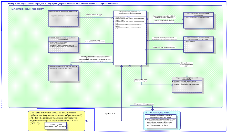 Подсистема управления нефинансовыми активами должна быть интегрирована с подсистемами управления закупками, управления расходами, управления доходами, управления кадровыми ресурсами, учета и отчетности, информационно-аналитического обеспечения, ведения реестров, справочников и формуляров системы «Электронный бюджет», а также взаимодействовать с ЕГРП, с реестром федерального имущества, формируемым Федеральным агентством по управлению государственным имуществом, а также с системами ведения реестра имущества субъектов (муниципальных образований) Российской Федерации, ведение которых осуществляет органами исполнительной власти субъектов (муниципальных образований).