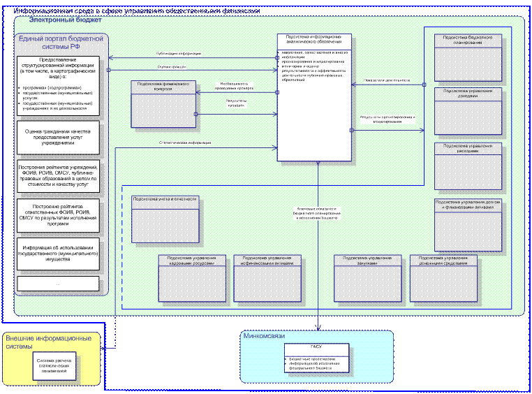 В рамках подсистемы информационно-аналитического обеспечения осуществляется накопление, сопоставление и анализ данных, поступающих из подсистем системы «Электронный бюджет», а также других внешних источников информации (информационных систем органов государственной статистики и т. п.).