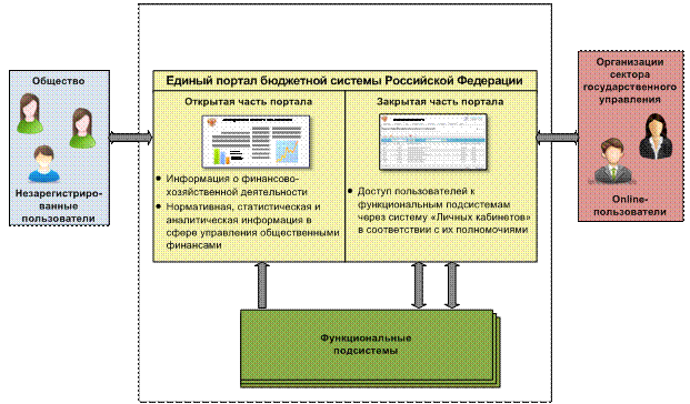 Для обеспечения доступа указанных категорий пользователей к системе «Электронный бюджет» Единый портал бюджетной системы Российской Федерации должен состоять из отдельных web-ресурсов, различающихся по уровню доступности из сети Интернет - открытой и закрытой части.