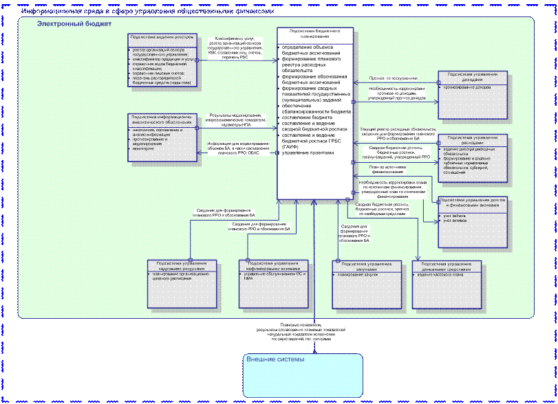 Подсистема бюджетного планирования должна быть интегрирована со всеми подсистемами системы «Электронный бюджет», за исключением подсистемы учета и отчетности, а также взаимодействовать с внешними информационными системами по ведению федеральной адресной инвестиционной программы, с внешними информационными системами ГРБС (учредителей).