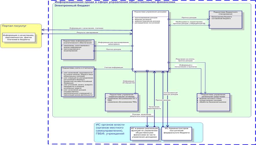 Подсистема управления доходами интегрирована с подсистемами системы «Электронный бюджет» бюджетного планирования, управления расходами, управления нефинансовыми активами, учета и отчетности, управления денежными средствами и информационно-аналитического обеспечения.