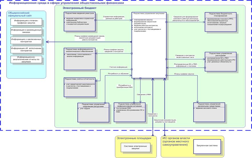 Подсистема управления закупками интегрирована с подсистемами системы «Электронный бюджет» управления нефинансовыми активами, управления кадрами, управления расходами, бюджетного планирования, управления денежными средствами, учета и отчетности, информационно-аналитического обеспечения, ведения реестров, справочников и формуляров.