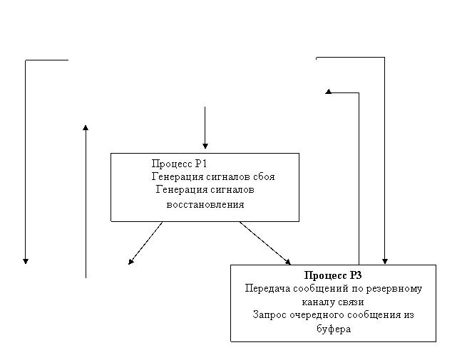 Магистраль передачи данных состоит из двух каналов (основного и резервного) и общего накопителя. При нормальной работе сообщения передаются по основному каналу за (7+-3) с. В основном канале происходят сбои через интервалы времени (200+-35) с. Если сбой происходит во время передачи, то за 2 с запускается запасной канал, который передает прерванное сообщение с самого начала. Восстановление основного канала занимает (23+-7) с. После восстановления резервный канал выключается и основной канал продолжат работу с очередного сообщения. Сообщения поступают через (9+-4) с и остаются в накопителе до окончания передачи. В случае сбоя передаваемое сообщение передается повторно по запасному каналу. Смоделировать работу магистрали передачм данных в течение одного часа. Определить загрузку запасного канала, частоту отказов канала и число прерванных сообщений.