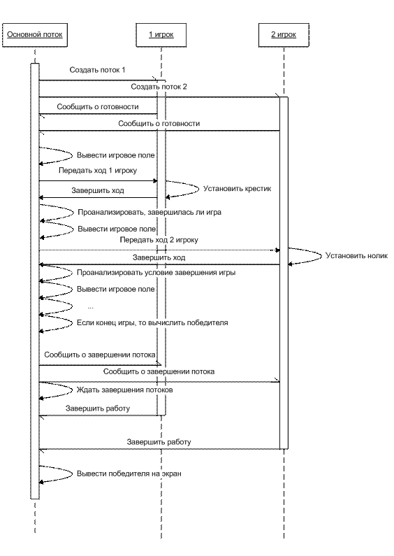 Пример последовательности взаимодействия потоков показан на следующей диаграмме: