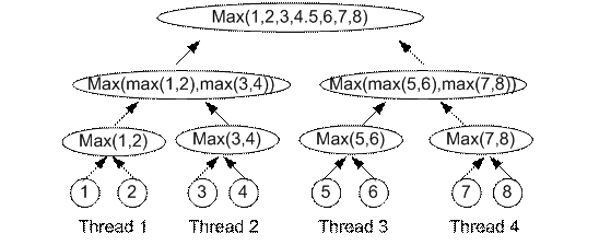 (Когда n/2 потоков могут одновременно вычислить максимумы половины элементов массива, потом еще n/4 потоков могут вычислить максимумы оставшихся элементов и т. п.)