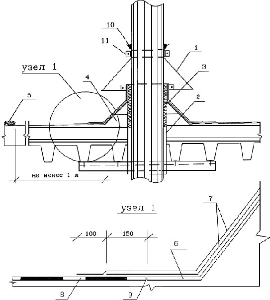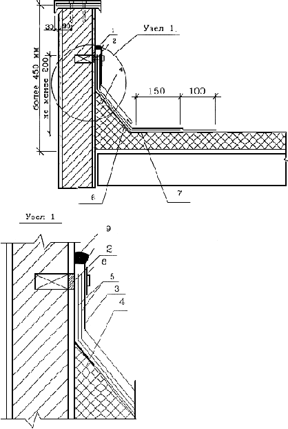 - наплавить два слоя рулонного материала "Изоэласт" с напуском нижнего края полотнищ на основной водоизоляционный ковер на 150 мм и 100 мм (рисунок 3, узел 1);