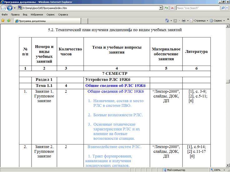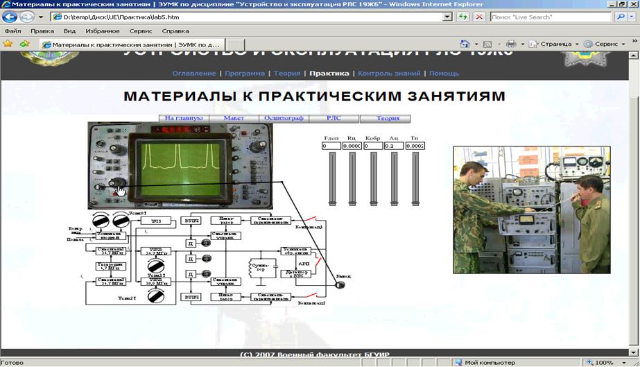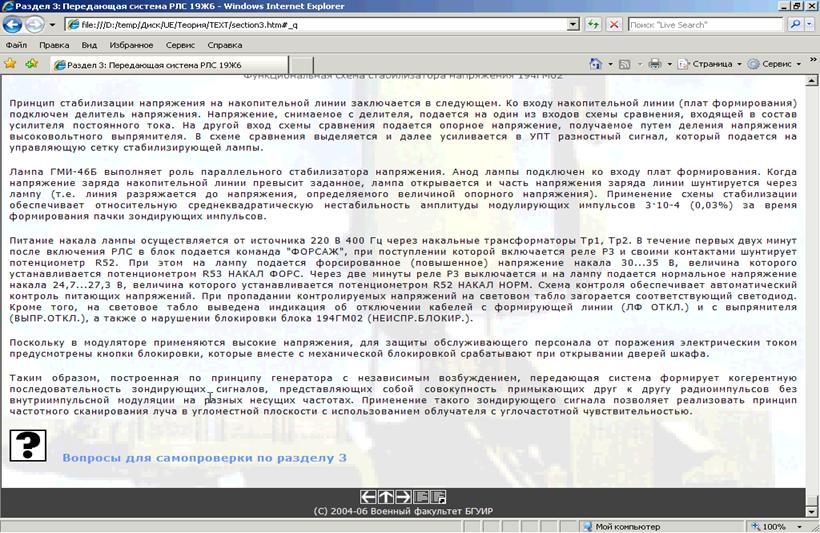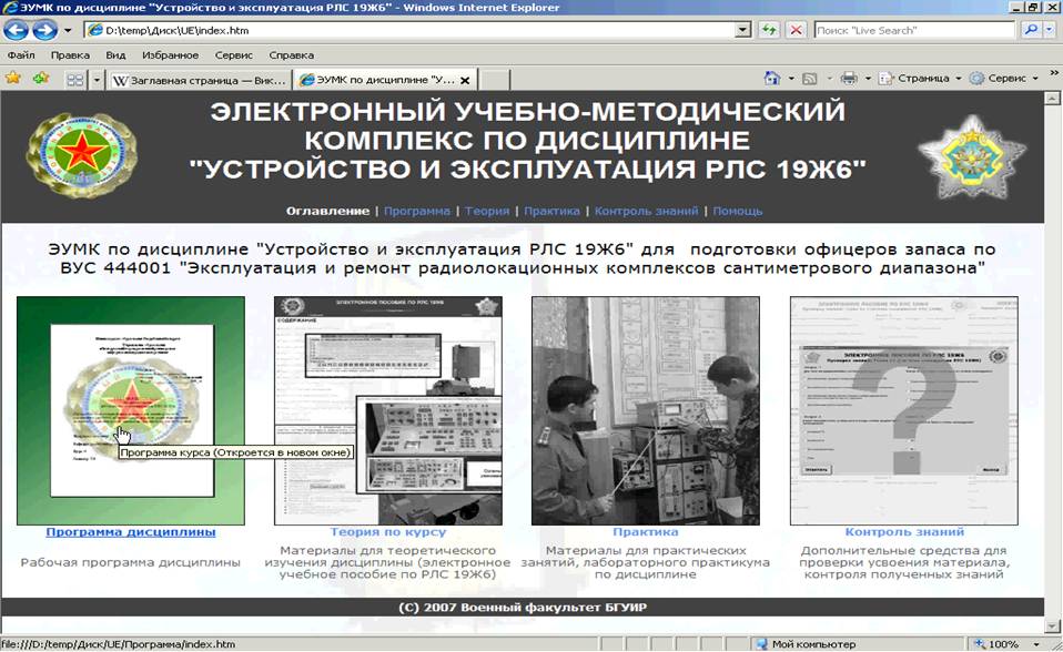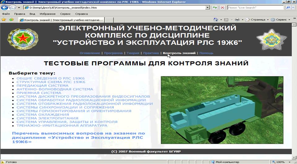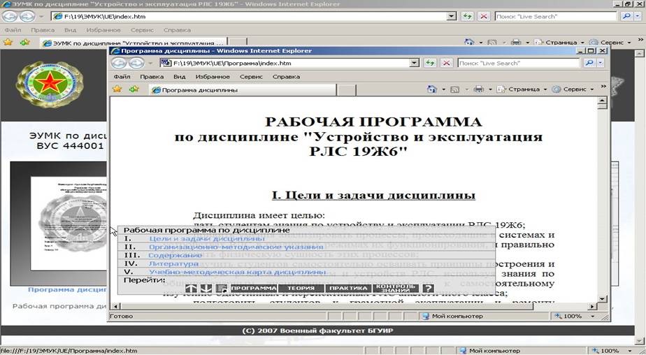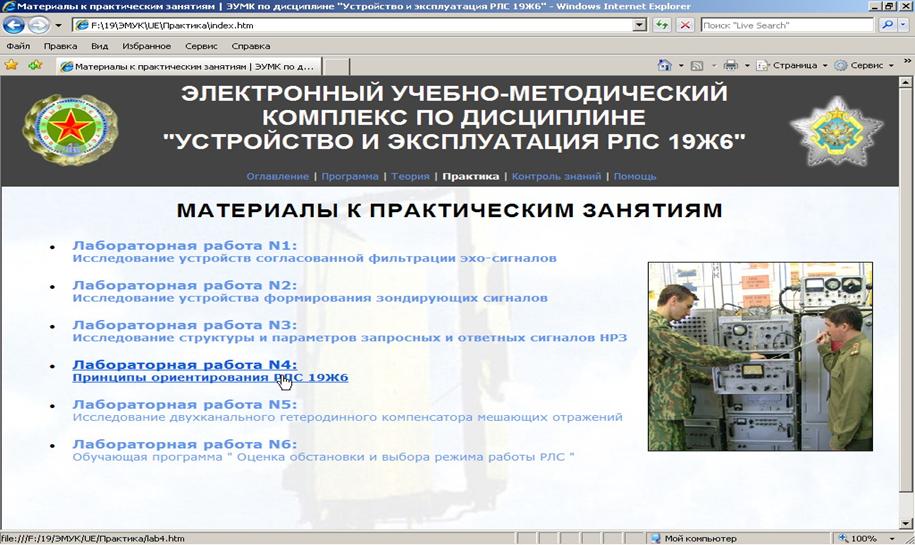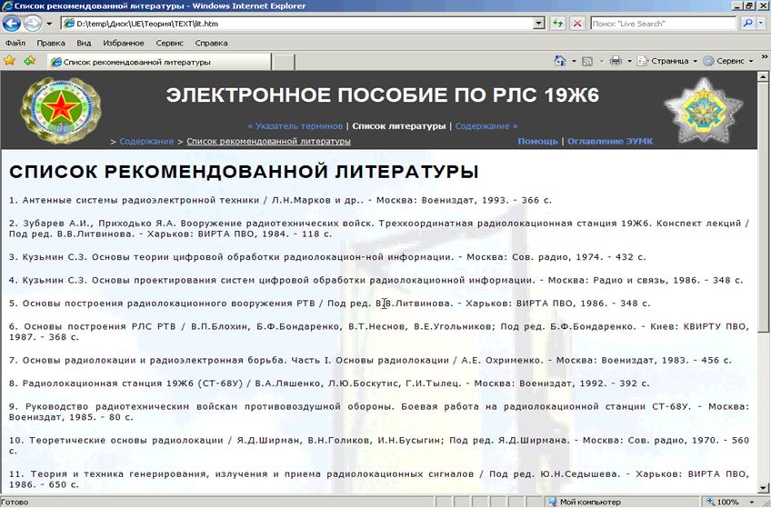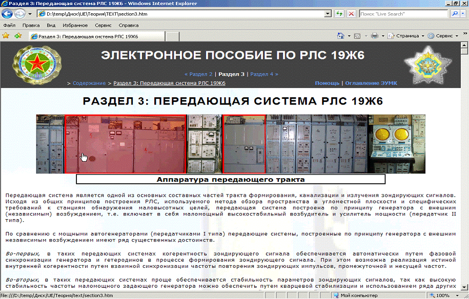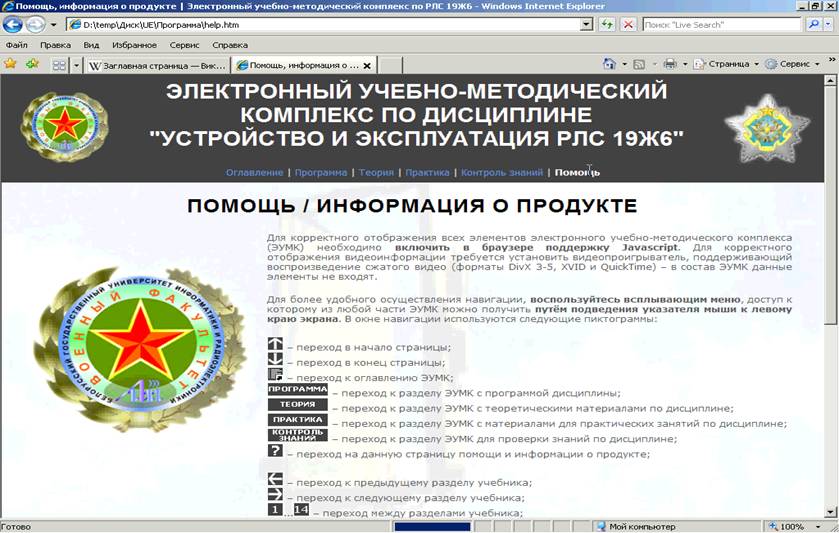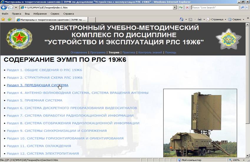 Оформление ЭУМКД рассмотрено на примере комплекса по дисциплине «устройство и эксплуатация РЛС 19Ж6». Данный комплекс выполнен с использованием WEB–технологий. Представление информации осуществляется с использованием пакета интернет-программ Microsoft Internet Explorer версии 6.0.