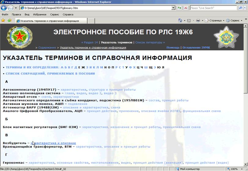 В разделе теория предусмотрен указатель терминов и сокращений, используемых в электронных изданиях (пример, приведен на рис. 12), который также имеет ссылки к электронным изданиям, где они приводятся. Ознакомившись с данными определениями, пользователь имеет возможность быстро вернуться к рассматриваемому ранее материалу.