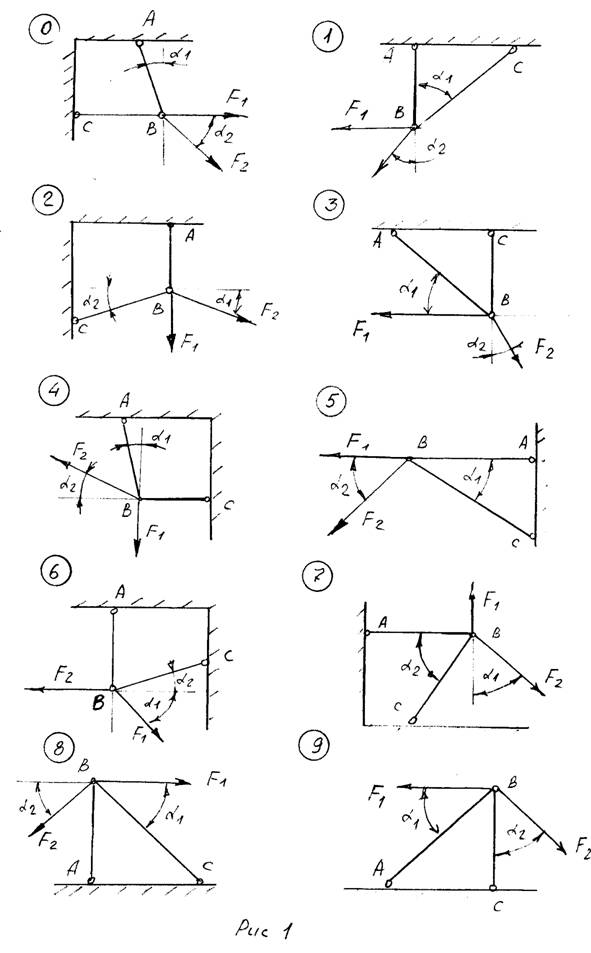 На кронштейн состоящий из двух стержней действуют силы F1 и F2. 1.Определить усилия в стержнях кронштейна и проверить полученный результат графически, построив многоугольник сил.