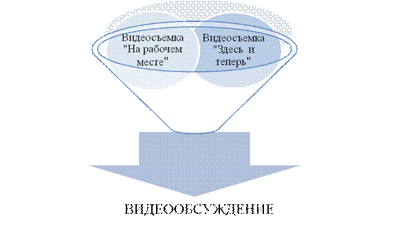 Характерной особенностью реализации технологии видеообсужения в режиме видео-обратной связи является то, что видеофрагменты для работы создаются непосредственно «Здесь и теперь» в процессе взаимодействия или, которые были запечатлены «На рабочем месте» (собирательное название контекста профессиональной жизнедеятельности в естественных условиях: в кабинете, неформальном общении, на производстве, собеседовании, совещании, переговорах, стажировке) (рисунок 1).