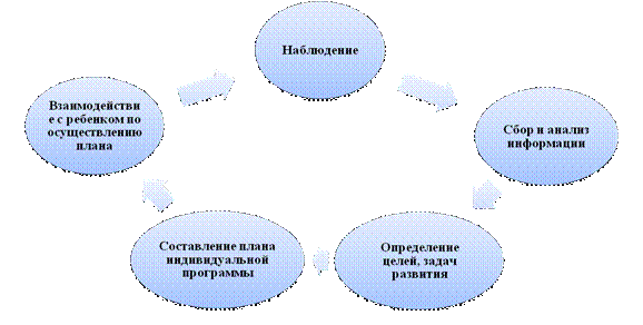 Процесс наблюдения и оценки представлен на следующей схеме: от наблюдения и сбора информации о ребёнке к действиям педагогов и родителей по осуществлению индивидуальных планов и программ развития детей.