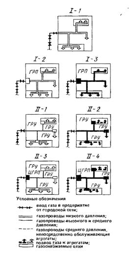 в) при присоединении к городским сетям через центральный ГРП, со средним давлением я межцеховых газопроводах, цеховыми ГРУ и с низким давлением в цеховых газопроводах (//-3); г) при присоединении к городским сетям через центральный ГРП со средним давлением в межцеховых газопроводах, цеховыми ГРУ и со средним давлением в цеховых газопроводах (//-4).