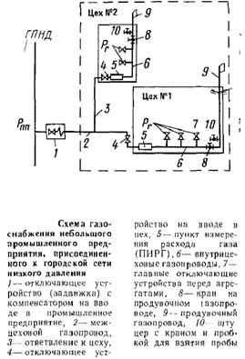 Схема промышленной системы газоснабжения в случае непосредственного присоединения к городским сетям низкого давления показана на рис. Данную схему проектируют для небольших коммунальных и промышленных предприятий. Это объясняется, во-первых, малой пропускной способностью сетей низкого давления, а во-вторых тем, что переменный режим потреблением газа предприятием будет отрицательно сказываться на режиме давлений у газовых приборов жилых, зданий, присоединенных к той же сети низкого давления.
