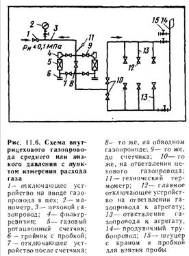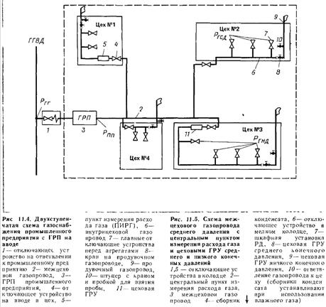 Некоторые схемы промышленных систем предусматривают проектирование центрального ГРП, который снижает и регулирует давление газа в межцеховых газопроводах. В этом случае в них устанавливают и пункты измерения расхода газа. В межцеховых газопроводах, как правило, поддерживают среднее давление и только у мелких потребителей — низкое. Высокое давление применяют там, где оно необходимо для газоиспользующих агрегатов. На вводе газопровода в цех снаружи или внутри здания устанавливают отключающее устройство. Внутрицеховые газопроводы прокладывают по стенам и колоннам в виде тупиковых линий. Необходимость кольцевания внутрицеховых газопроводов может возникнуть лишь для особо важных промышленных цехов. На ответвлениях к агрегатам устанавливают главные отключающие устройства. Газопроводы промышленных предприятий и котельных оборудуют специальными продувочными трубопроводами с запорными устройствами. Отводы к продувочным трубопроводам предусматривают от последних участков внутрицеховых газопроводов и от каждого газопровода агрегата перед последним по ходу газа отключающим устройством.