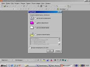 Диалоговая панель приложения PowerPoint – Создать презентацию, используя… содержит три вкладки: Мастер автосодержания, Шаблоны оформления и Пустая презентация. Выберете Пустую презентацию. Появится диалоговая панель Создать слайд.