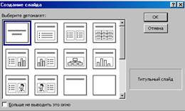 - на диалоговой панели Создать слайд выбрать тип автомакета Титульный слайд,