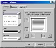 - на появившейся диалоговой панели Формат таблицы на вкладках Границы, Заливка, Надпись можно задать детали оформления таблицы.