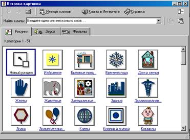 На появившейся диалоговой панели Microsoft Clip Gallery открывается коллекция рисунков Clip Art, в которой можно выбрать нужный рисунок для слайда