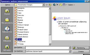 На появившейся диалоговой панели Применить шаблон оформления в раскрывающемся списке можно выбирать различные стили дизайна и просматривать их в окне просмотра.