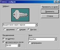 Для настройки перехода от одного слайда к другому необходимо выделить слайд и ввести команду Показ слайдов Þ Смена слайдов...