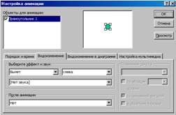 На диалоговой панели в верхнем окне Порядок анимации перечислены объекты данного слайда. После выбора одного из них можно приступить к настройке анимационных эффектов.