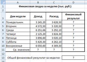 3. На третьей строке введите названия колонок таблицы – «Дни недели», «Доход», «Расход», «Финансовый результат», далее заполните таблицу исходными данными согласно заданию 1.