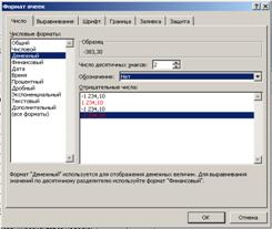 5. Для ячеек с результатом расчетов задайте формат – «Денежный» с выделением отрицательных чисел красным цветом (рис. 2) (Главная – Выравнивание – вкладка Число – формат Денежный – отрицательные числа – красные. Число десятичных знаков задайте равное 2).