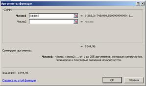 ) на панели инструментов или функцией СУММ (Формула – Вставить функцию - категория Математические – СУММ).В качестве первого числа выделите группу ячеек с данными для расчета суммы – D4:D10 (рис. 4).