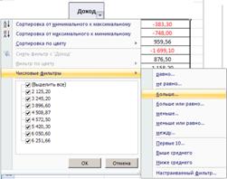 Для установления режима фильтра установите курсор внутри таблицы и воспользуйтесь командой Главная – Сортировка и фильтр - Фильтр. В заголовках полей появятся стрелки выпадающих списков. Щелкните по стрелке в заголовке поля, на которое будет наложено условие (в столбце «Доход»), и вы увидите список всех неповторяющихся значений этого поля. Выберите команду для фильтрации – Условие (рис. 7).