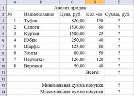 Задание 2. Заполнить таблицу, произвести расчеты, выделите минимальную и максимальную суммы покупки (рис. 10); по результатам расчета построить круговую диаграмму суммы продаж.