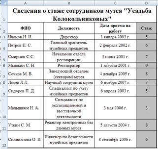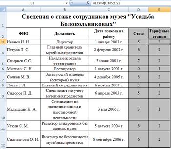 3. Переименовать Лист1 в Сведения о стаже сотрудников