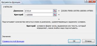 5. В ячейке Е20 произведите расчет количества месяцев, в которых сумма покрытия больше 100000 р. (используйте функцию СЧЁТЕСЛИ, указав в качестве диапазона «Значение» интервал ячеек Е7:Е14, а в качестве условия > 100000). После расчета формула в ячейке Е20 будет иметь вид =СЧЁТЕСЛИ (Е7:Е14) (рис. 3).