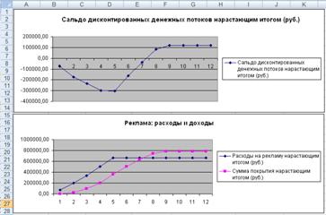 Графики дают наглядное представление об эффективности расходов на рекламу и графически показывают, что точка окупаемости инвестиций приходится на июль месяц.